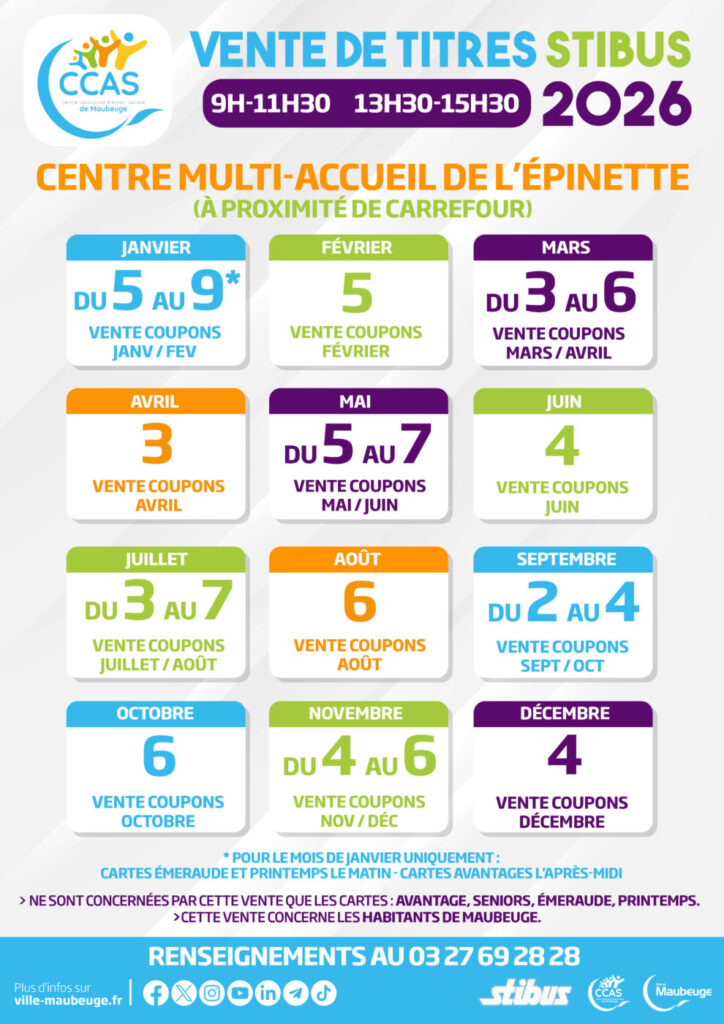 Les prochaines dates des ventes des titres Stibus organisées par le CCAS de la ville de Maubeuge auront lieu :