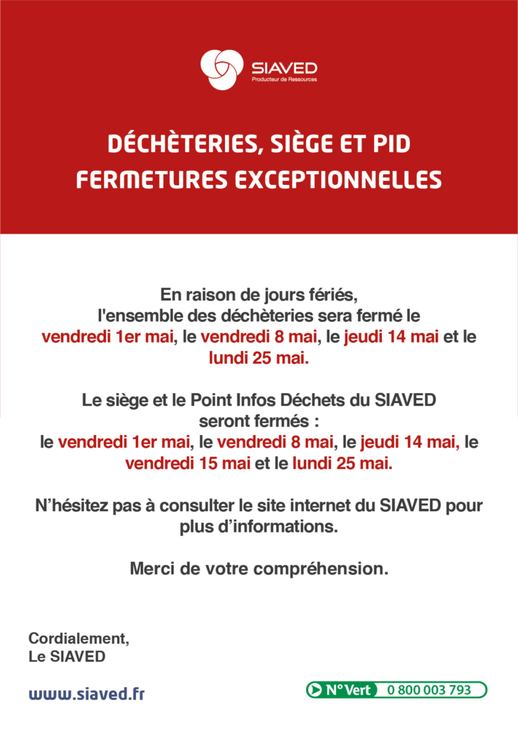 Le siège et le Point infos déchets du SIAVED seront également fermés les vendredi 1er mai, vendredi 8 mai, jeudi 14 mai, vendredi 15 mai et lundi 25 mai.