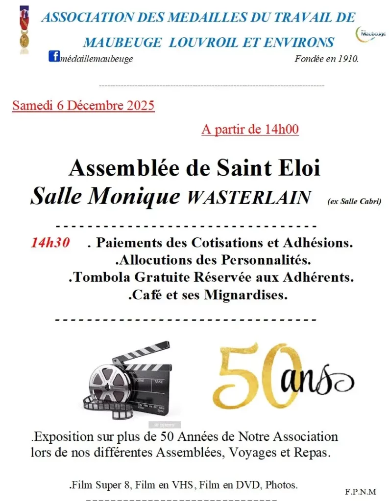 L’association des médaillés du travail de Maubeuge Louvroil et environs tiendra son assemblée de Saint Eloi à 14h à la salle Monique Wasterlain