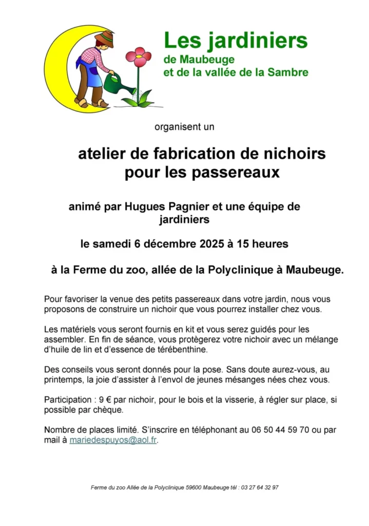 Les Jardiniers de Maubeuge organisent un atelier de fabrication de nichoirs pour les passereaux, animé par Hugues Pagnier et une équipe de jardiniers à 15h à la ferme du zoo
