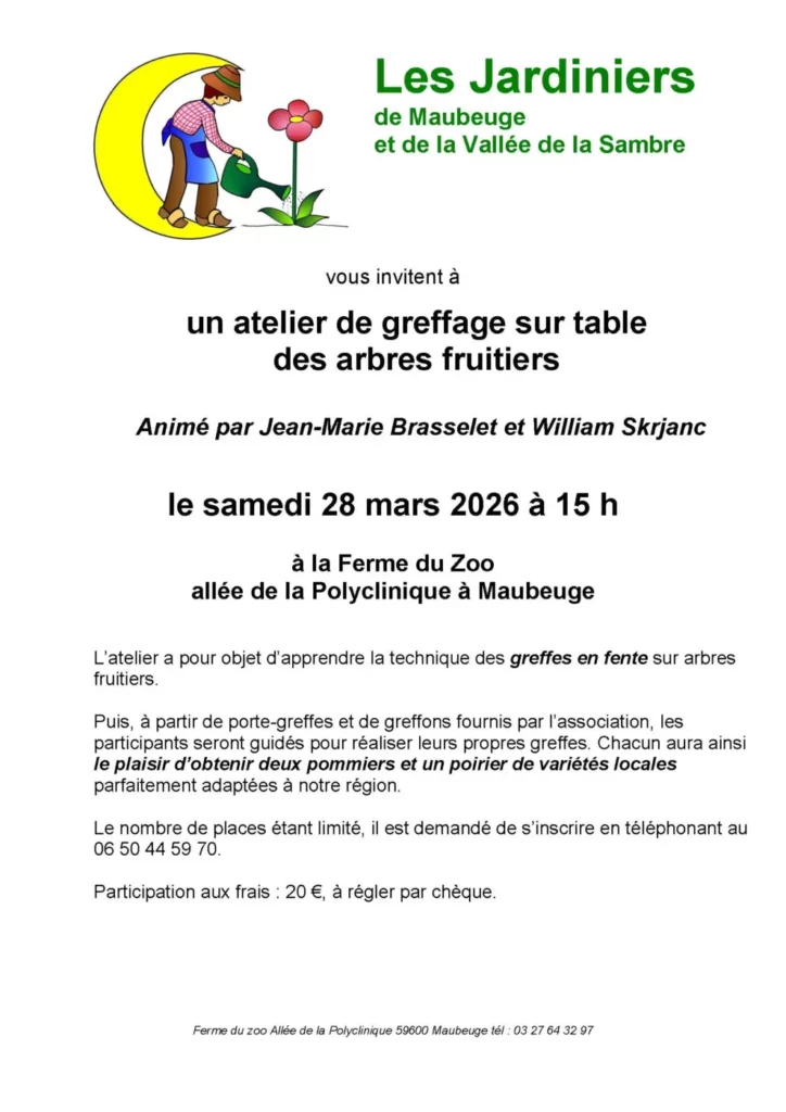 Les Jardiniers de Maubeuge et de la Vallée de la Sambre vous invitent à un atelier de greffage sur table des arbres fruitiers animé par Jean-Marie Brasselet et William Skrjanc à 15h à la ferme du zoo