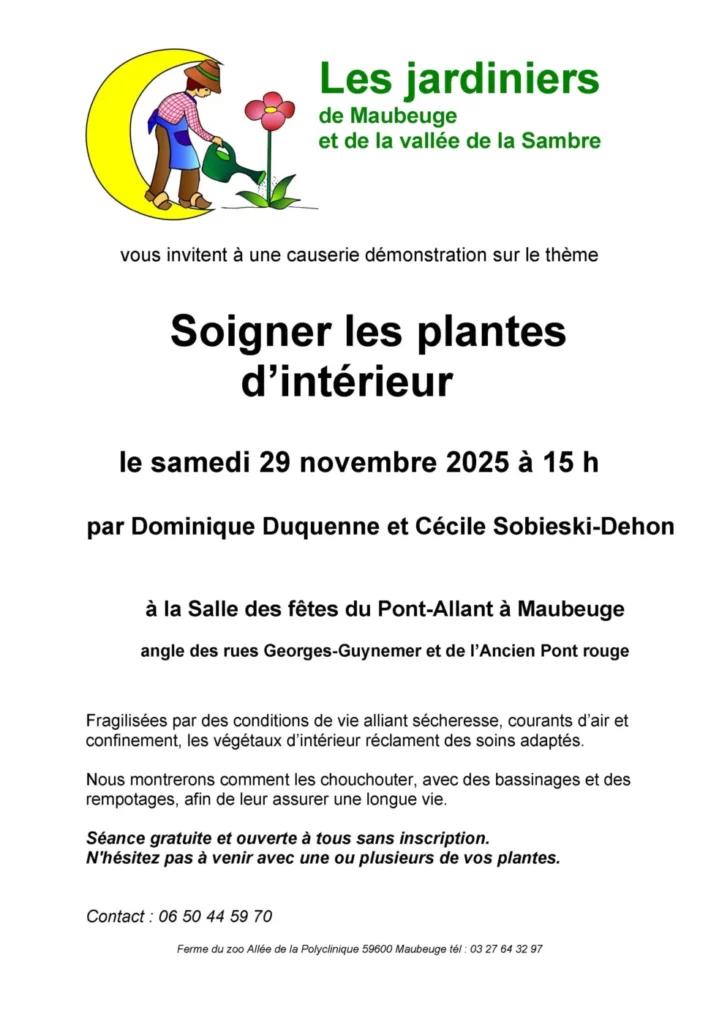 Les Jardiniers de Maubeuge organisent une causerie démonstration sur le thème « Soigner les plantes d’intérieur » à 15h par Dominique Duquenne et Cécile Sobieski-Dehon à la Salle des fêtes du Pont-Allant à Maubeuge