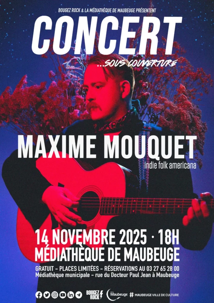 Bougez Rock et la mรฉdiathรจque de Maubeuge prรฉsentent un concert de Maxime Mouquet (inde folk americana) ร 18h ร la mรฉdiathรจque