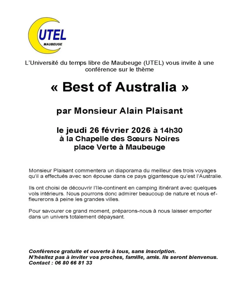 L’Université du temps libre de Maubeuge (UTEL) vous invite à une conférence sur le thème « Best of Australia » par Monsieur Alain Plaisant à 14h30 à la Chapelle des Sœurs Noires