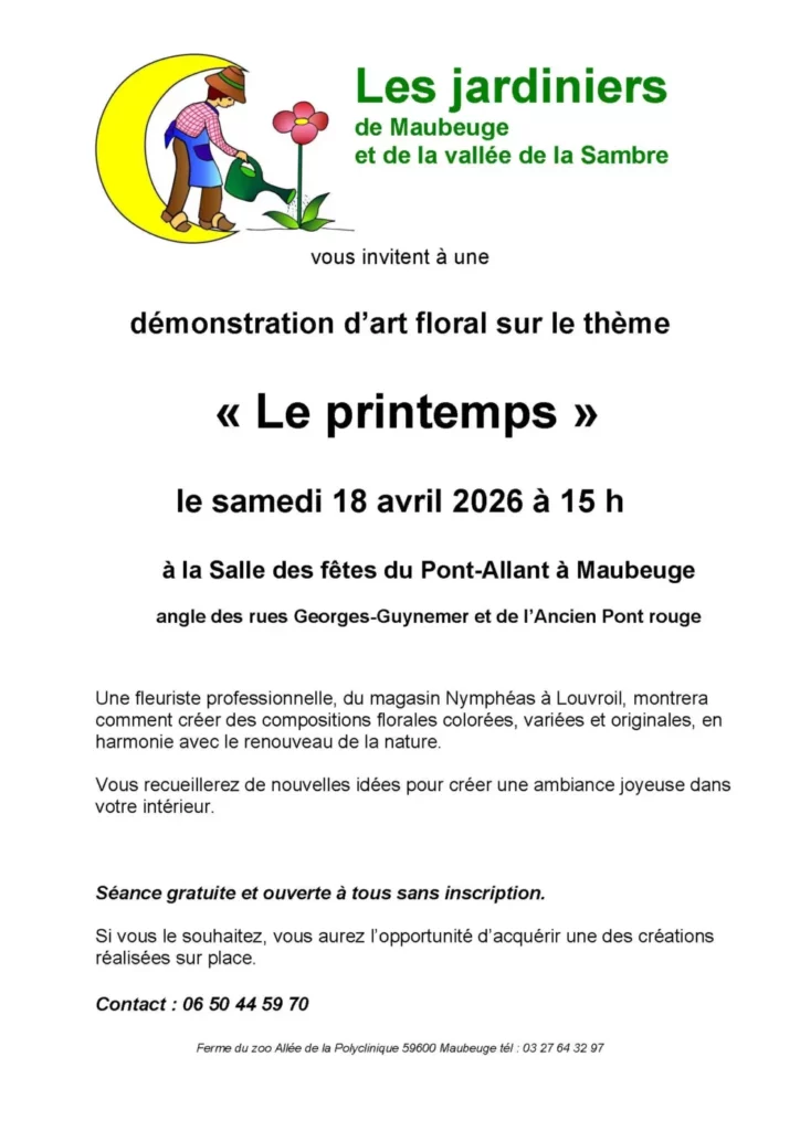 Les Jardiniers de Maubeuge et de la Vallée de la Sambre vous invitent à une démonstration d’art floral sur le thème « Le printemps » à 15h à la salle des fêtes du Pont-Allant