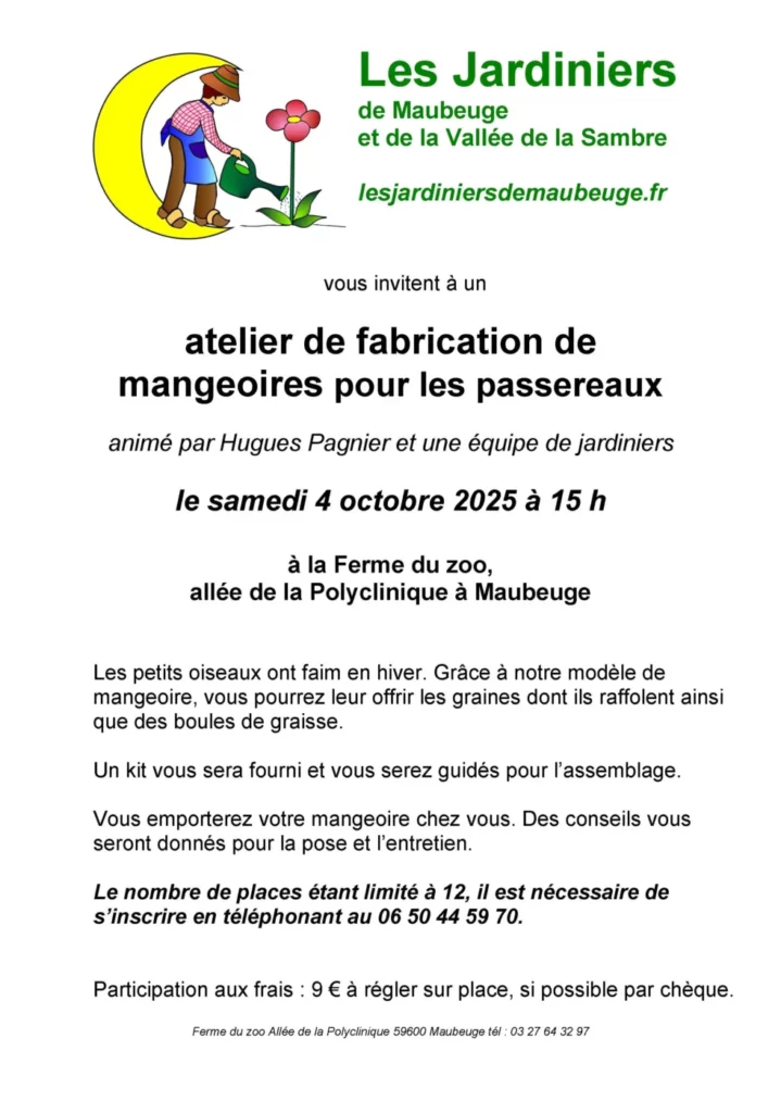 Les Jardiniers de Maubeuge organisent un atelier de fabrication de mangeoires pour les passereaux animรฉ par Hugues Pagnier et une รฉquipe de jardiniers ร 15h ร la Ferme du zoo ร Maubeuge.