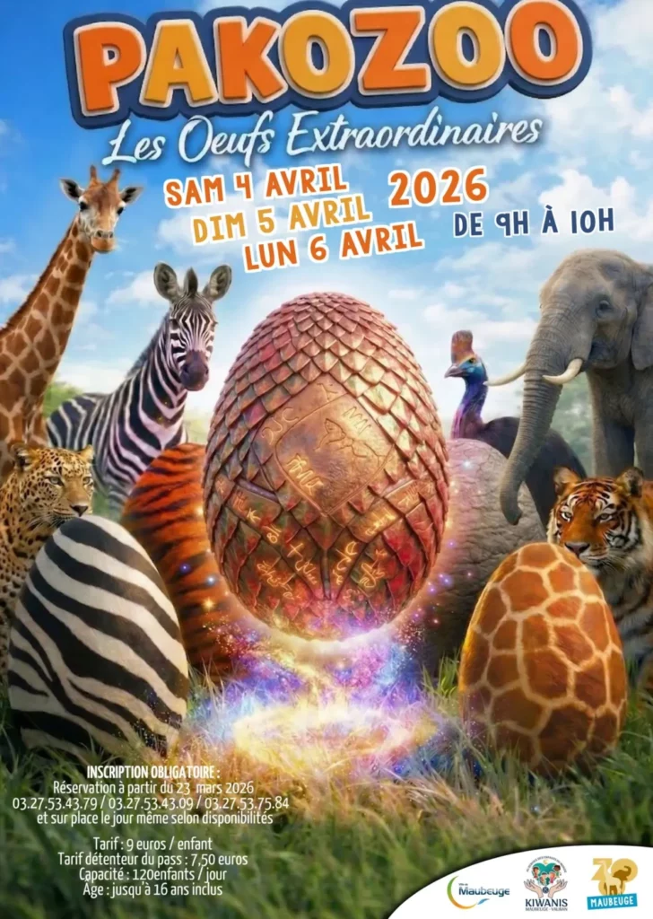 pendant le week-end de Pâques, en partenariat avec Kiwanis Maubeuge Vauban , partenaire historique de la chasse aux œufs au Zoo de Maubeuge qui offre des centaines de poule en chocolat pour l’occasion.