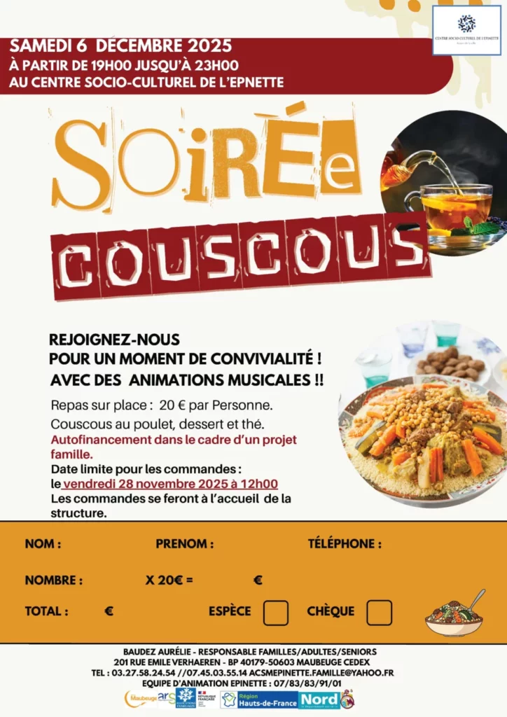 Le secteur famille/parentalité du Centre Socio-Culturel de l’Épinette organise une soirée couscous de 19h à 23h au centre socio-culturel de l’Épinette